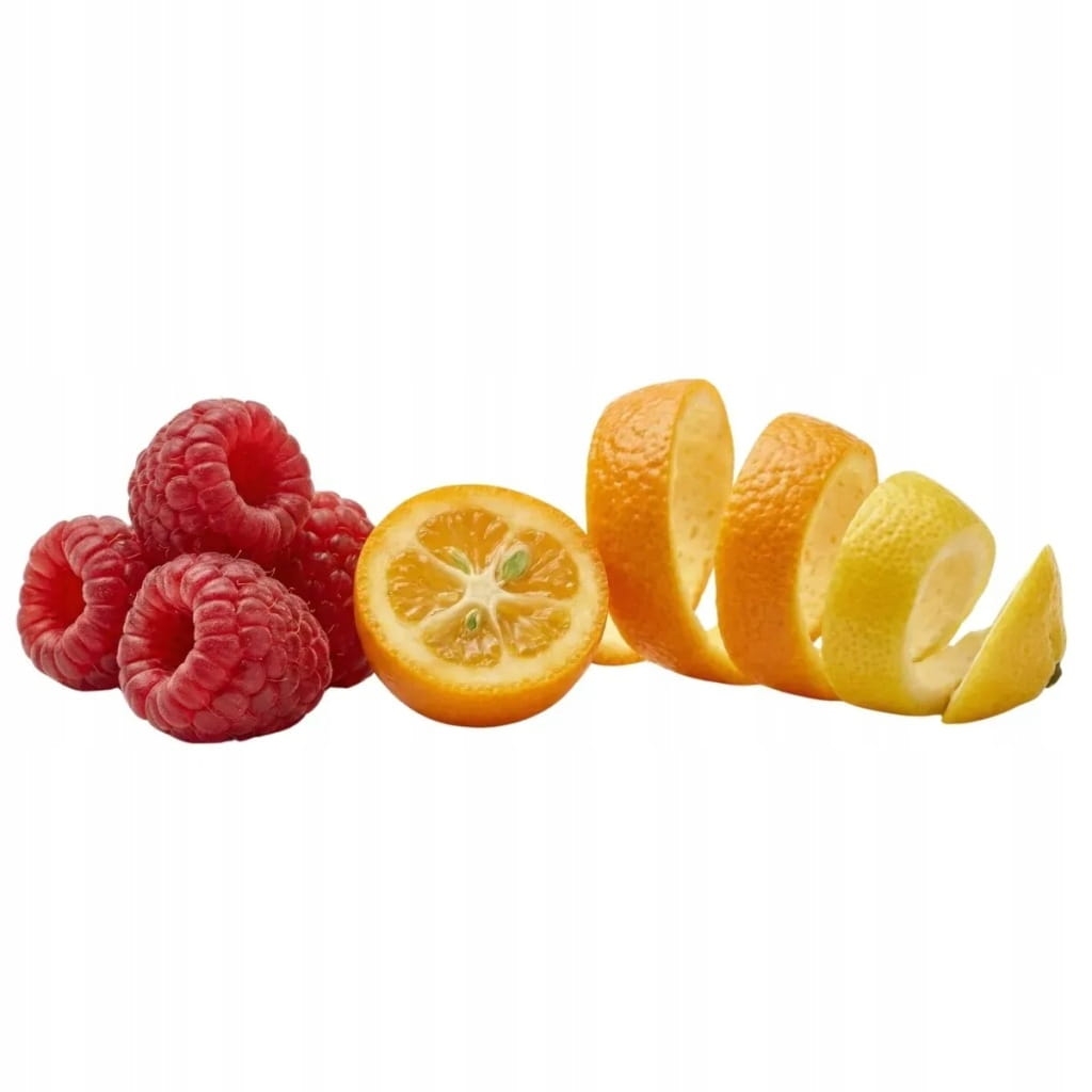 Biała herbata, malina, kumkwat (owoc), skórka cytryny, aromat.