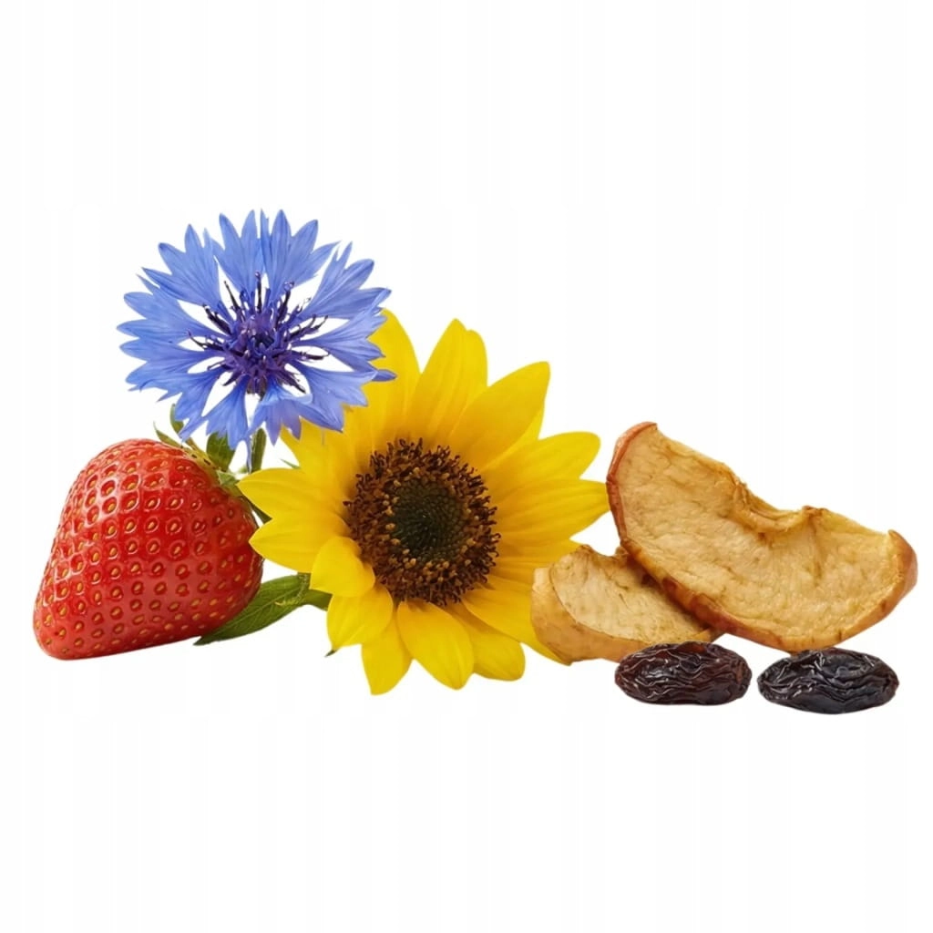 Rooibos, jabłko, truskawka, słonecznik płatek, chaber płatek, aronia, aromat.