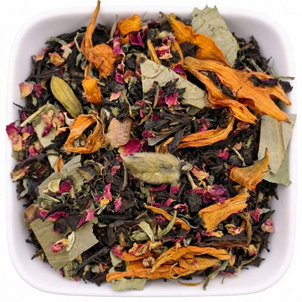 "Słoneczne Lato" to wyjątkowa kompozycja zielonej i czarnej herbaty liściastej, uzupełniona o skórkę granatu, płatki róży oraz kwiatowe akcenty magnolii i lilii. Ta unikalna mieszanka zachwyca swoją barwnością, bogactwem aromatów i niepowtarzalnym charakterem, który przenosi prosto w letnie dni pełne światła i radości. To herbata, która łączy egzotyczny urok z elegancką subtelnością, idealna zarówno na co dzień, jak i jako efektowna propozycja na prezent.