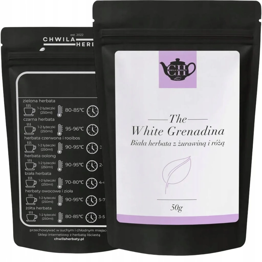 Delikatność białej herbaty, świeżość zielonej i owocowo-kwiatowa finezja White Grenadina to wyjątkowa kompozycja dwóch gatunków herbat - białej i zielonej - wzbogacona aromatycznymi płatkami róży oraz suszoną żurawiną. Całość tworzy unikalną mieszankę o świeżym, lekko słodkawym charakterze z nutami owocowymi i kwiatowymi. Idealna dla osób poszukujących lekkiego, ale wyrazistego naparu do codziennego rytuału - zarówno na ciepło, jak i w wersji mrożonej.