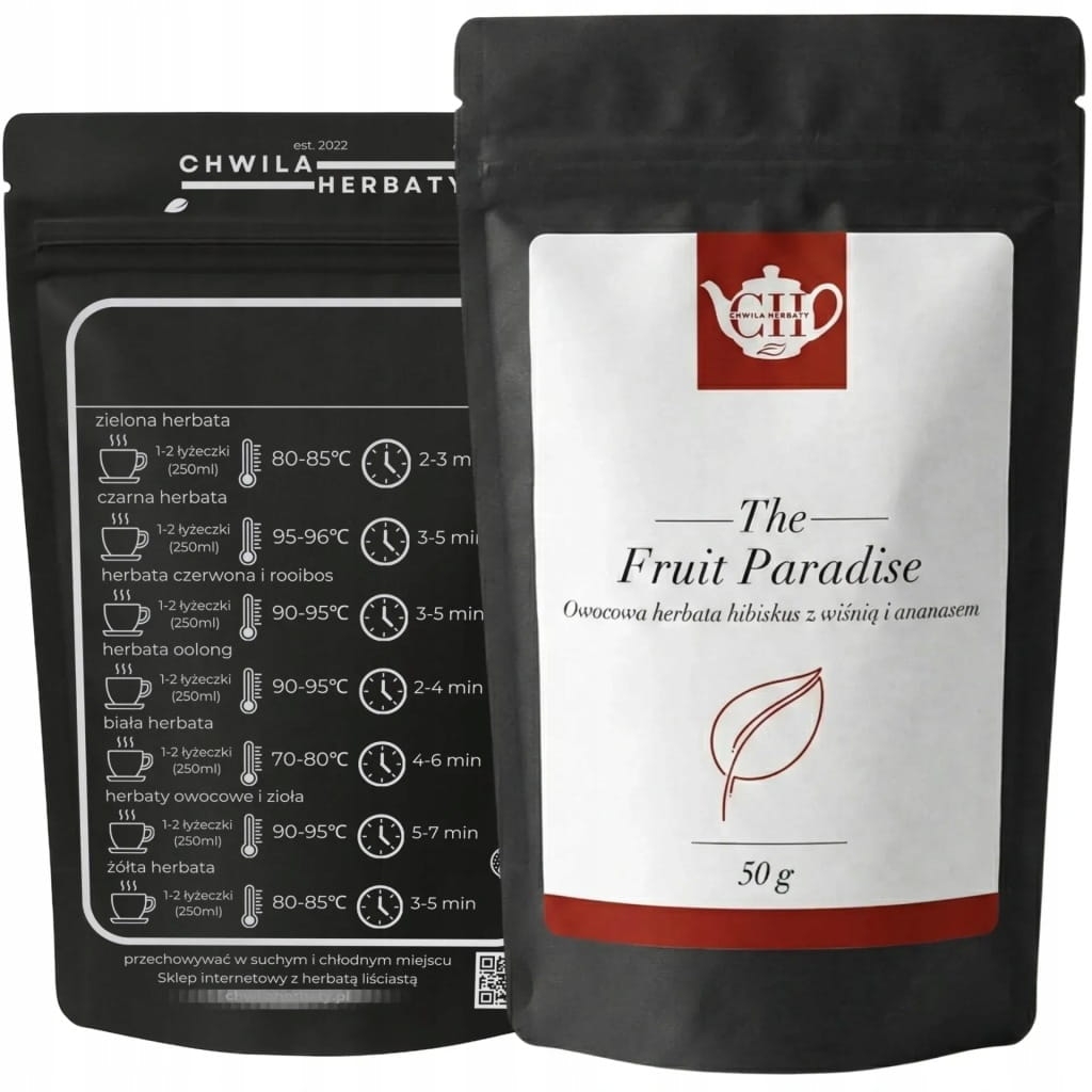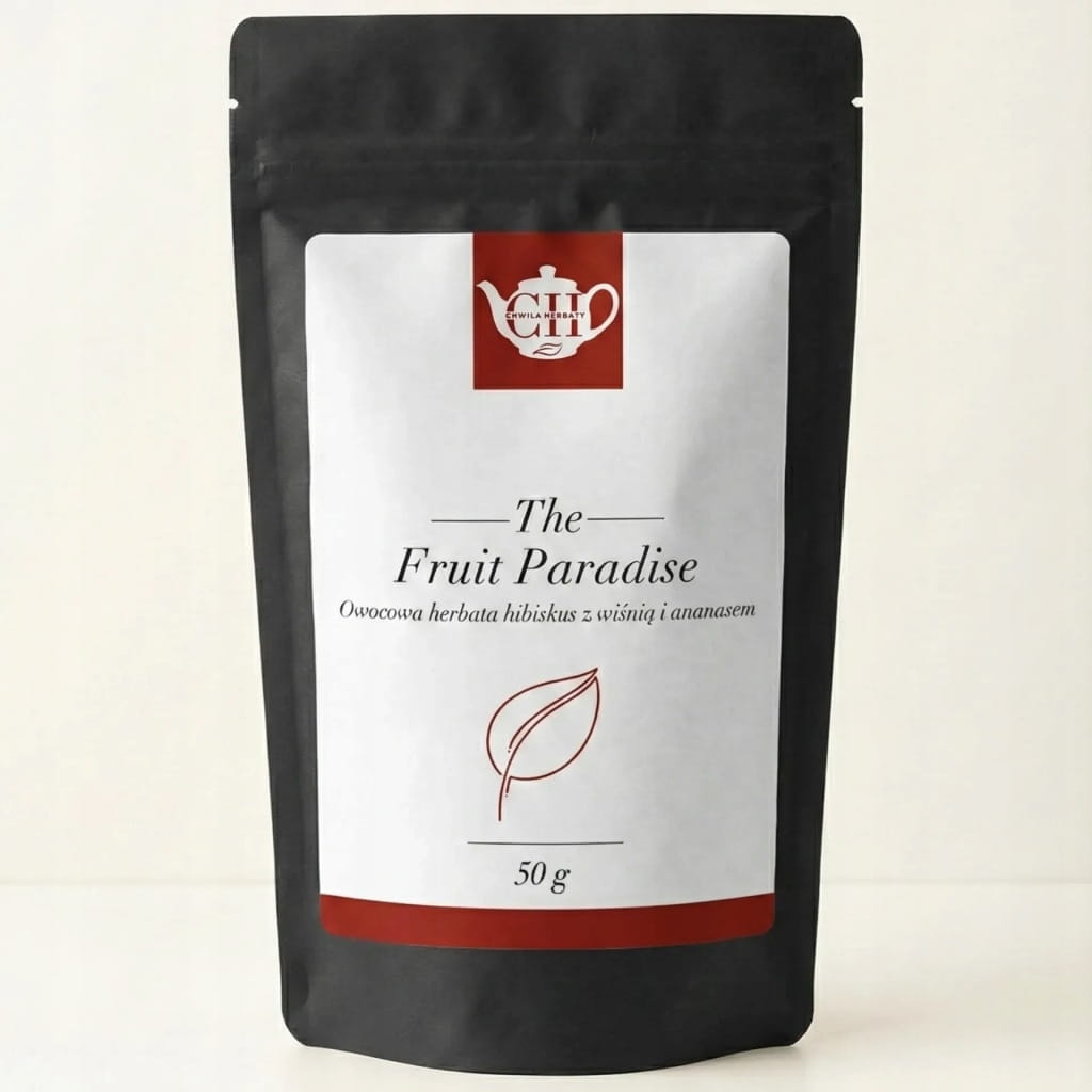 Owocowy Raj to intensywna, owocowa kompozycja na bazie hibiskusa, wzbogacona o soczystą wiśnię, słodki ananas, wyrazistą aronię oraz delikatne rodzynki. Mieszanka zachwyca głęboką rubinową barwą naparu oraz wyrazistym, owocowo-kwaskowym profilem smakowym, idealnym zarówno na gorąco, jak i w wersji mrożonej. To propozycja dla osób poszukujących herbaty bezkofeinowej, intensywnej w smaku i bogatej w owocowe aromaty.