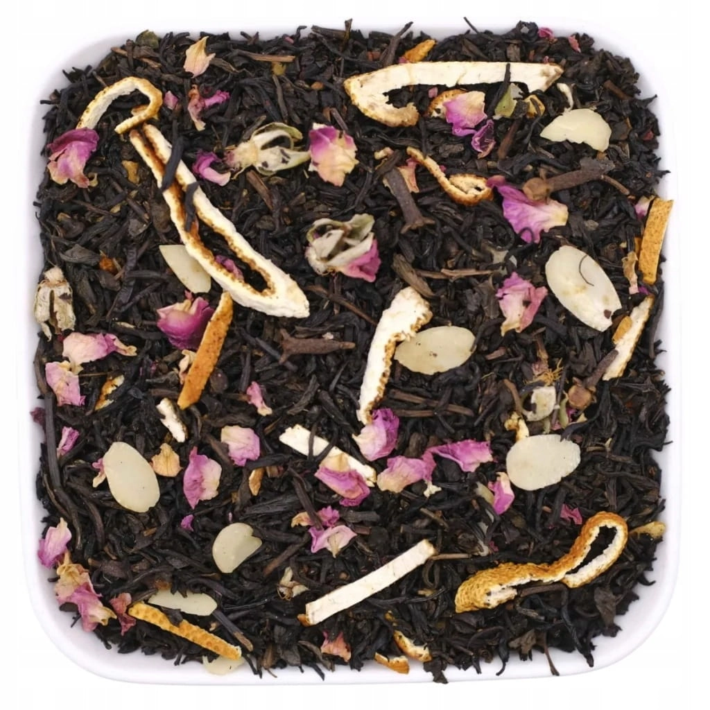 Czarna herbata, róża - płatek, skórka pomarańczy, migdał - płatki, goździk, kardamon, aromat.