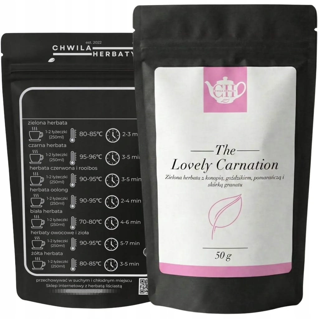 Lovely Carnation to aromatyczna zielona herbata liściasta premium, która łączy klasyczną bazę zielonej herbaty z wyrazistymi dodatkami roślinnymi i korzennymi. W tej starannie skomponowanej mieszance znajdziesz liście konopi, kwiat goździka, soczystą pomarańczę oraz skórkę granatu, tworzące harmonijną i wielowymiarową kompozycję smakową. To propozycja dla osób, które szukają herbaty o wyraźnym charakterze, a jednocześnie cenią naturalność i jakość składników.