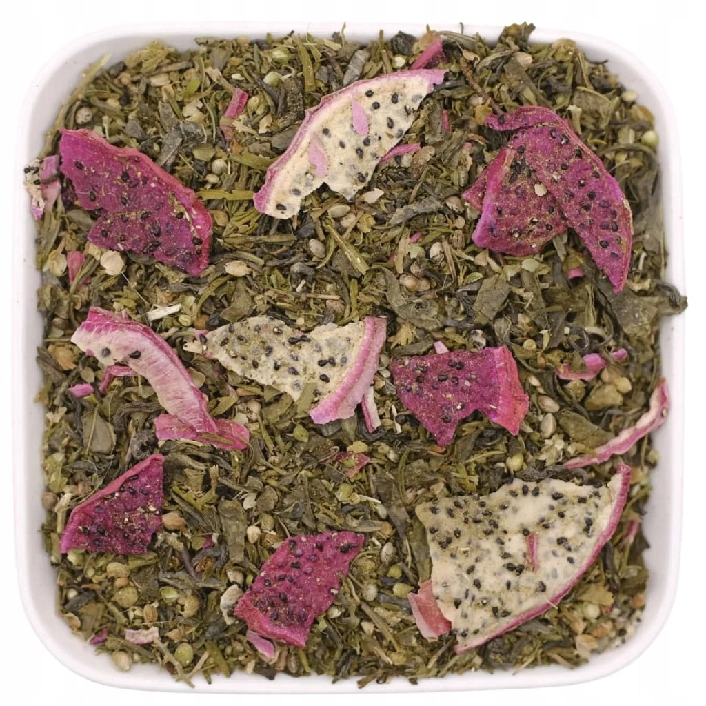 Herbata zielona, konopia liść 35%, smoczy owoc biały i czerwony.