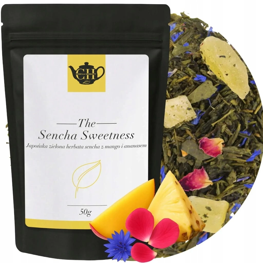 Sencha Sweetness to elegancka, japońska zielona herbata liściasta typu sencha, wzbogacona kawałkami soczystego mango i ananasu. Tropikalna słodycz owoców harmonijnie łączy się z roślinną świeżością senchy, a delikatne płatki róży i chabra bławatka dodają naparowi subtelnie kwiatowego charakteru. To pełna lekkości, a zarazem wyrazista propozycja dla miłośników herbat owocowych w wydaniu premium.