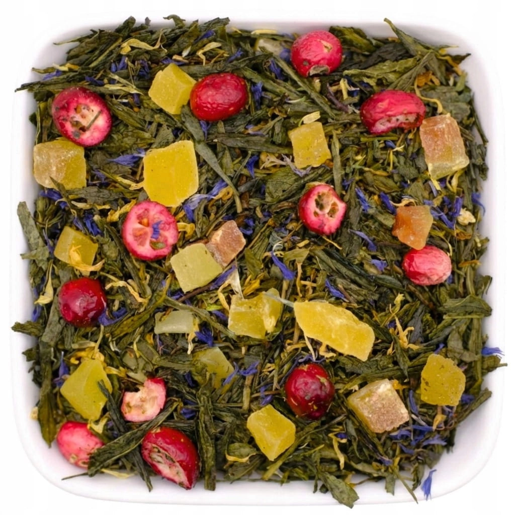 - Składniki: herbata zielona (Sencha), ananas, żurawina, mango, papaja, morwa biała, płatki nagietka, płatki chabra, naturalny aromat