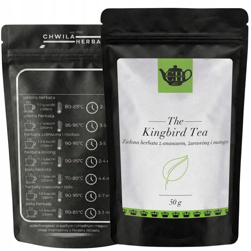 - zawiera etykietę z przodu z nazwą i logo ChwilaHerbaty oraz nadruk z tyłu z informacjami o sposobie parzenia, temperaturze i czasie,